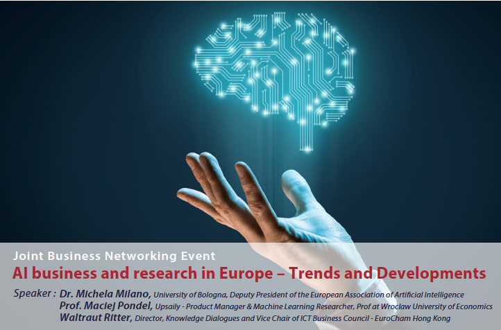 Speakers: Dr. Michela Milano, University of Bologna, Deputy President of the European Association of Artificial Intelligence. Prof. Maciej Pondel, Upsaily-Product Manager & Machine Learning Researcher, Prof at Wroclaw University of Economics. Waltraut Ritter, Director, Knowledge Dialogues and Vice Chair of ICT Business Council-EuroCham Hong Kong.
